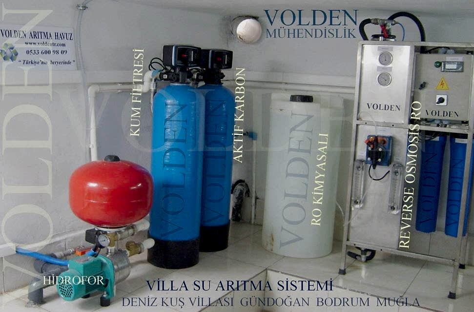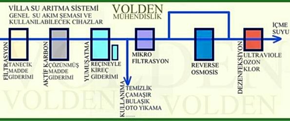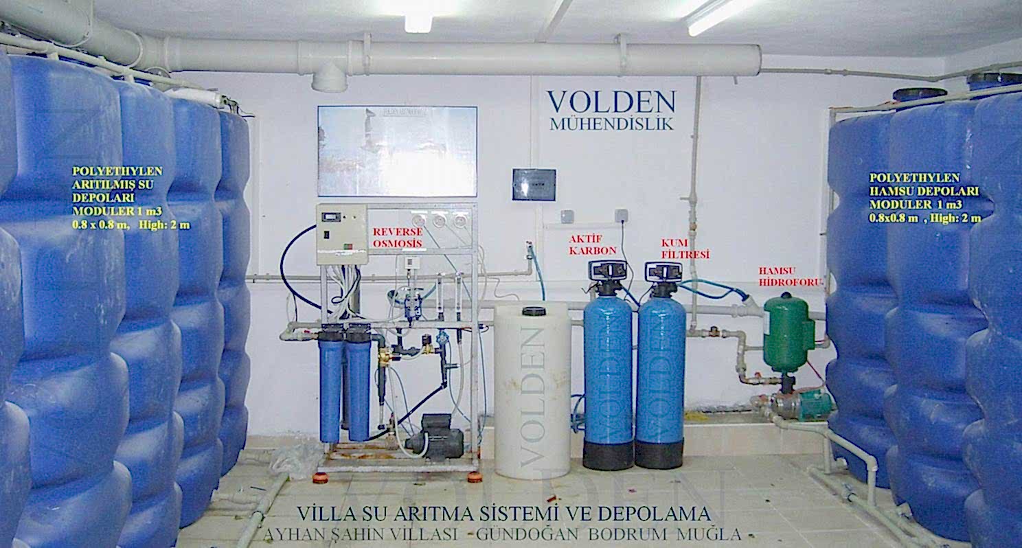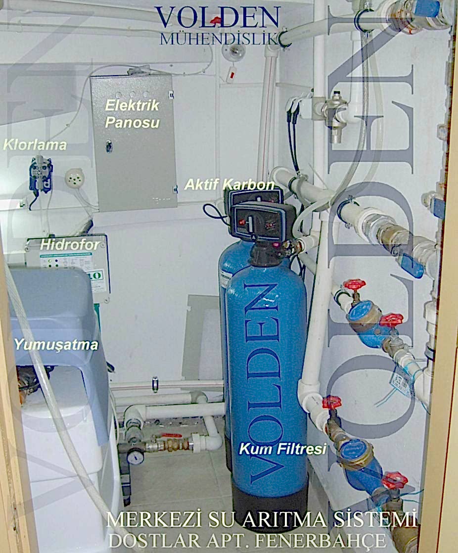 FİLTRASYON ÜNİTESİ: Askıda katı maddeler olarak adlandırılan, suda çözünmeyen kum, çamur ve tortular vb. gibi maddeler su ile çalışan cihazları oldukça olumsuz şekilde etkiler, özellikle de içme sularında, hem estetik açıdan hem de sağlığa uygun olmayan maddeler oluştururlar. İyi bir suyun tortusunun olmaması ve renginin de berrak olması gerekmektedir. Genel bir arıtım sisteminin temel olması gereken ana ünitesi, filtrasyon ekipmanlarıdır. Çünkü kendisinden sonra uygulanacak arıtım elemanlarının da tortuya karşı mutlaka korunması sağlanmalıdır. Filtrelenen su , tortusuz, renksiz ve berrak bir görünüm kazanır. Bu amaçla aşağıdaki filtreleme cihazı kullanılabilir. Filtreleme cihazları bir veya birkaç adet de olabilir. Sırasıyla, önce 100 mikron veya 50 mikron, sonra 20 mikron seviyelerinde 2 kademe filtrasyon olursa daha kaliteli ve filtrasyondan sonra gelen cihazların daha sağlıklı çalışmasını gerçekleştiren, sistemi yormayan bir filtrasyon olur. Ancak İSKİ suyu nispeten temiz olduğundan yalnızca kum filtresi de yeterli olur. Filtrasyon ünitesi ne kadar hassas olursa ve iyi çalışırsa, filtrasyondan sonraki üniteler de o kadar iyi, problemsiz ve verimli çalışır. Otomatik ters yıkamalı filtreler fiberglass gövdelerden oluşmaktadır. Farklı granül boyutlarında quartz ve ANTRASIT minarellerinden oluşarak çok katmanlı bir geçiş sağlar. Ham su yukarıdan aşağıya geçerken suda bulunan askıda katı maddeler, quartz ve antrasitte tutulur. Filtre tarafından tutulan kirlilik yükü ise, cihaz üzerinde ayarlanan zamanlarda otomatik olarak yapılan ters yıkama işlemi ile temizlenir. Su, 100 mikrona kadar filtrelenir. ADSORBSİYON ÜNİTESİ:Suda bulunan organik maddeler, suyun içerisinde tad, koku ve renk olarak açığa çıkar. Özelliklede klasik dezenfeksiyon yöntemlerinden biri olan sodyumhipoklorid (klor) suda serbest halde bulunur. Açık alanlardan sızabilecek ilaçlar, tarım ilaçları, vb. organik maddeler her an suya karışabilecek şekildedir. Bu tür maddeleri tutmak amacıyla aktif karbon denilen bir malzeme kullanılır. Aktif karbon kendisine temas eden maddeleri mıknatıs benzeri yüzeyinde tutar. Bu işleme adsorbsiyon(yüzeyde tutunma) denir Aktif karbondan geçen su, organik maddelerinden arındırılmış, renksiz, kokusuz, berrak bir şekilde olacaktır. Sudaki mineral ve tuzları muhafaza ederek suda renk, tad ve kokuya neden olabilecek organik maddeler, klor bileşikleri ve ağır metalleri yüksek absorbsiyon kapasitesine sahip aktif karbon ile giderilir. Aktif karbon, fiberglass gövdenin içine uygulanarak otomatik ters yıkama düzeneği ile rejenerasyonu sağlanmaktadır. Aktif karbon mineralleri arasında biriken kirlilik yükü cihaz üzerinde ayarlanan zamanlarda otomatik olarak yapılan ters yıkama işlemi ile temizlenerek aktif karbonun ömrü uzatılır.
